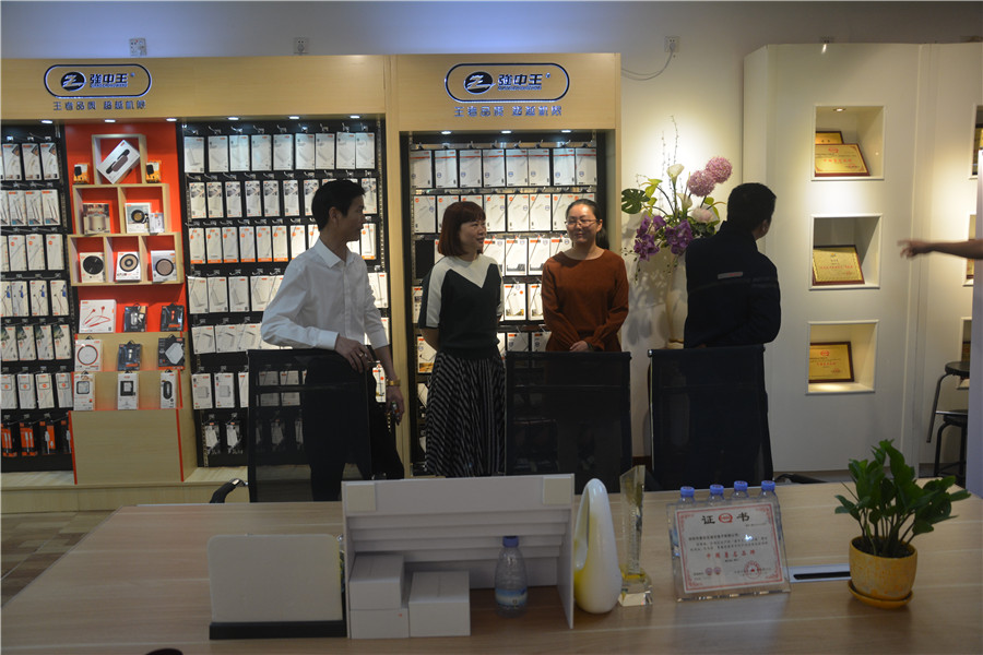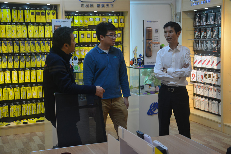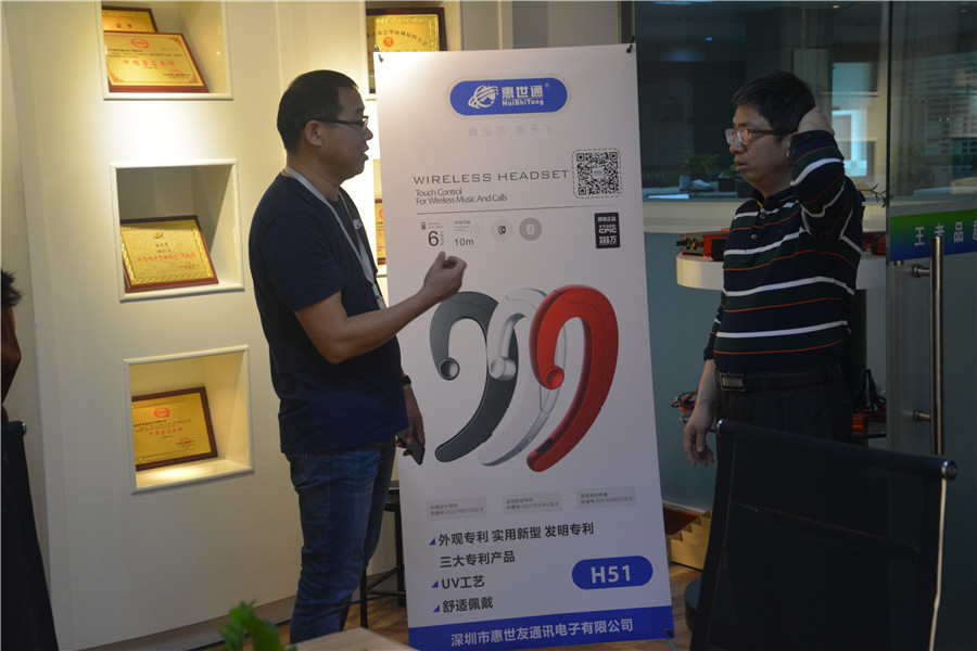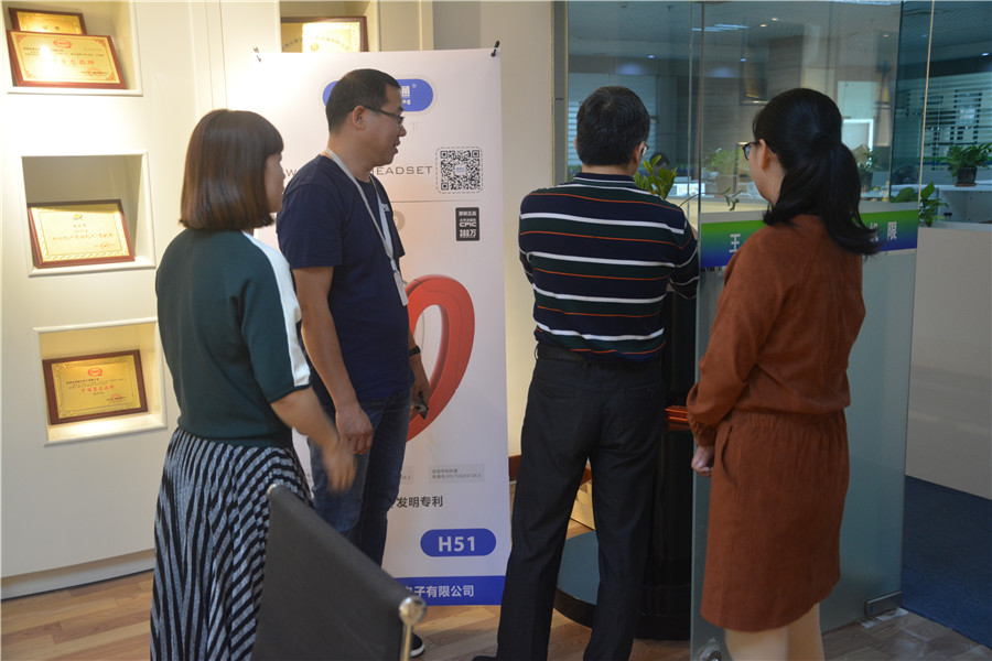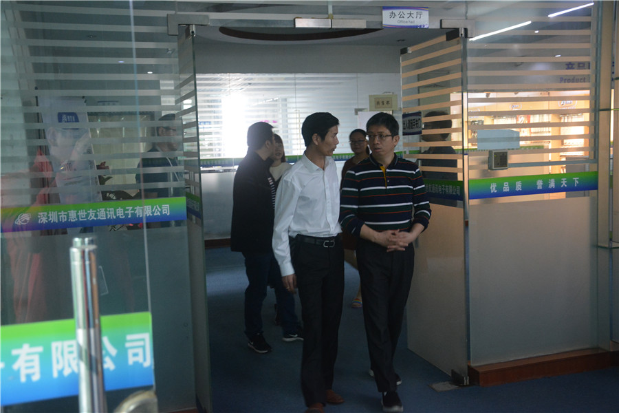 惠世友通讯电子有限公司董事长(左)与董事长助理(右)陪同平湖街道办领导参观公司产品展示厅合影留念