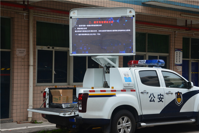 宣传车播放道路安全视频,教我们遵守交通法规,远离大货车的盲区以及转弯内切角
