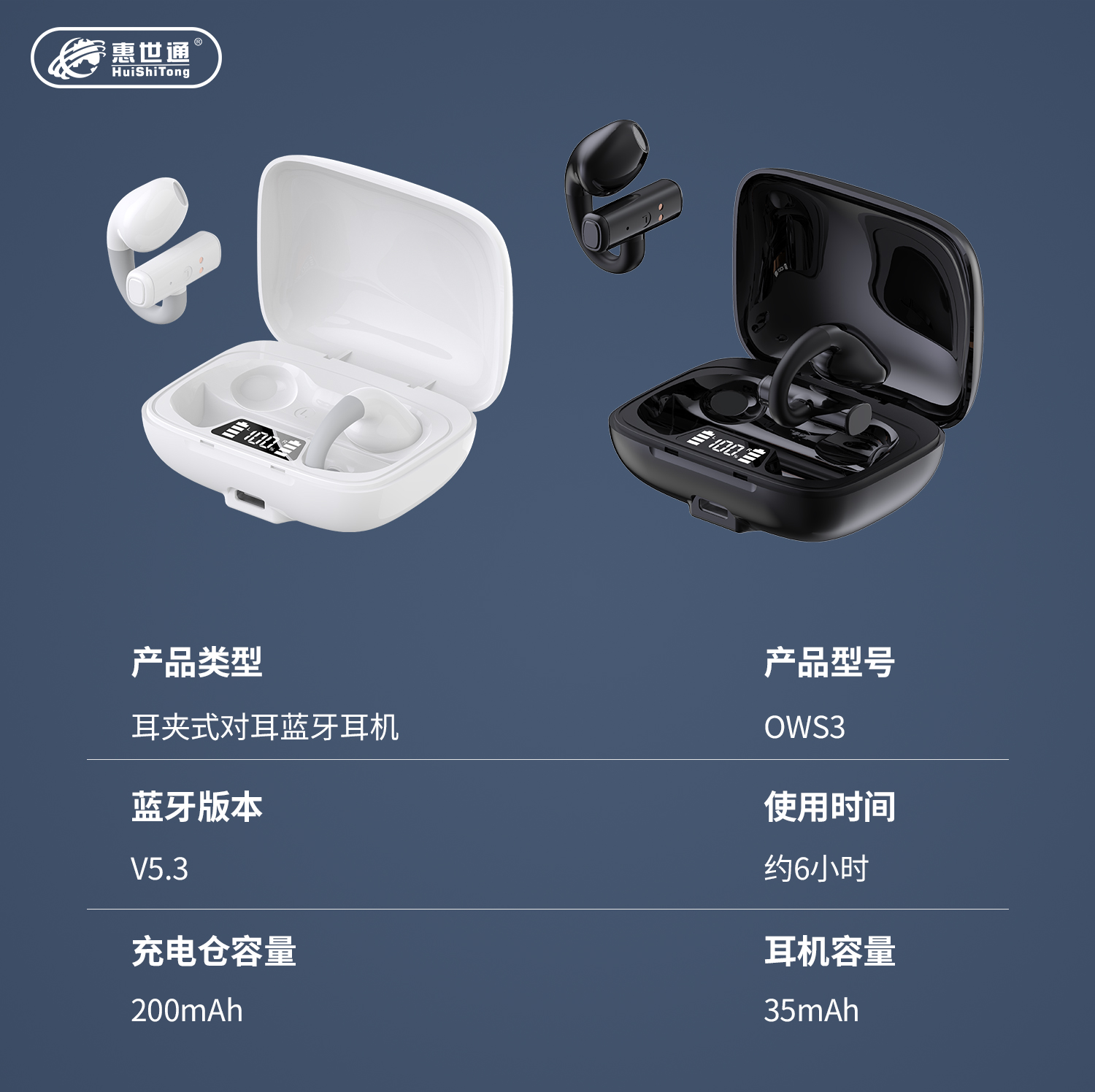 1.喷UV光油处理+合页工艺,时尚耐用。数字电量显示。 2.蓝牙版本:V5.3兼容V1.1、V1.2、V2.0、V2.1、2.1+EDR、V3.0、V4.1、 V5.0标准。支持双耳通话,自动连接,使用方便。 3.耳夹式佩带更舒适时尚,不易掉。支持左右耳机配带。触摸操作,简易方便。