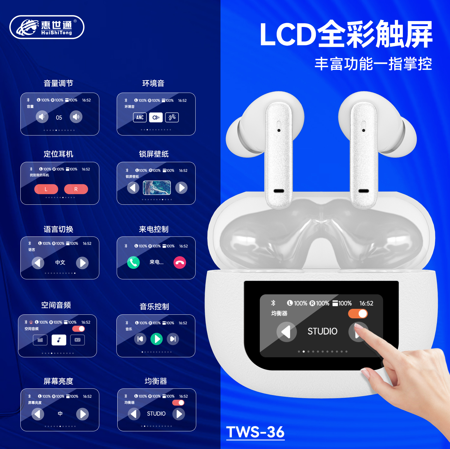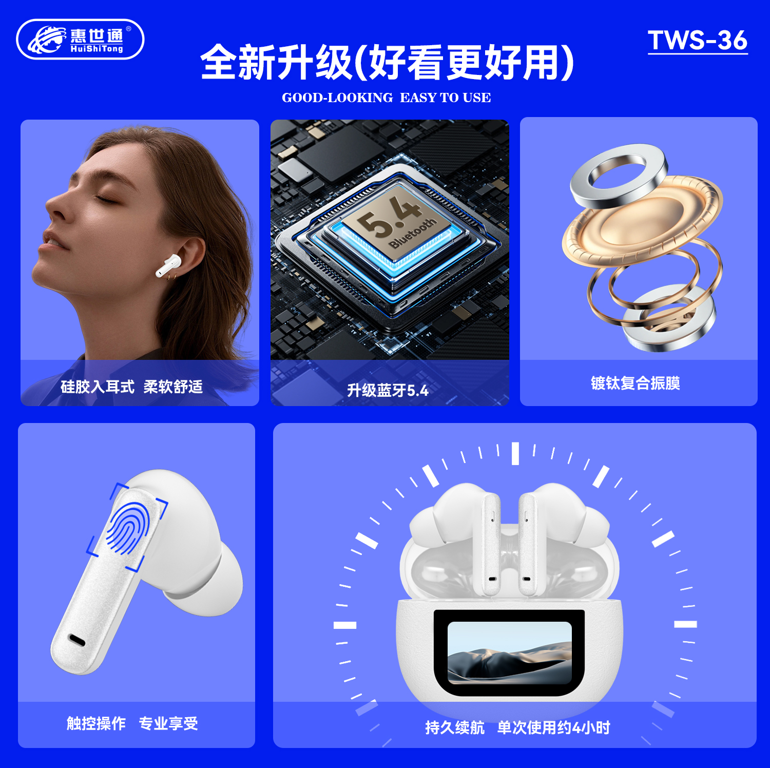 1.时尚设计,磨砂壳体+14.7英寸多功能触摸屏,美观耐用,高颜值。 2.蓝牙版本:V5.4兼容V1.1、V1.2、V2.0、V2.1、2.1+EDR、V3.0、V4.1、 V5.0标准。支持双耳通话,自动连接,使用方便。 3.使用时间:约4H,充电仓电池300mAh大容量。符合ROHS标准。 4.硅胶入耳式耳机,佩戴更舒适。支持左右耳机单独使用。触摸操作,简易方便。 5.12大屏显功能切换,耳机带降噪功能,充电仓屏显丰富功能,一指操控。