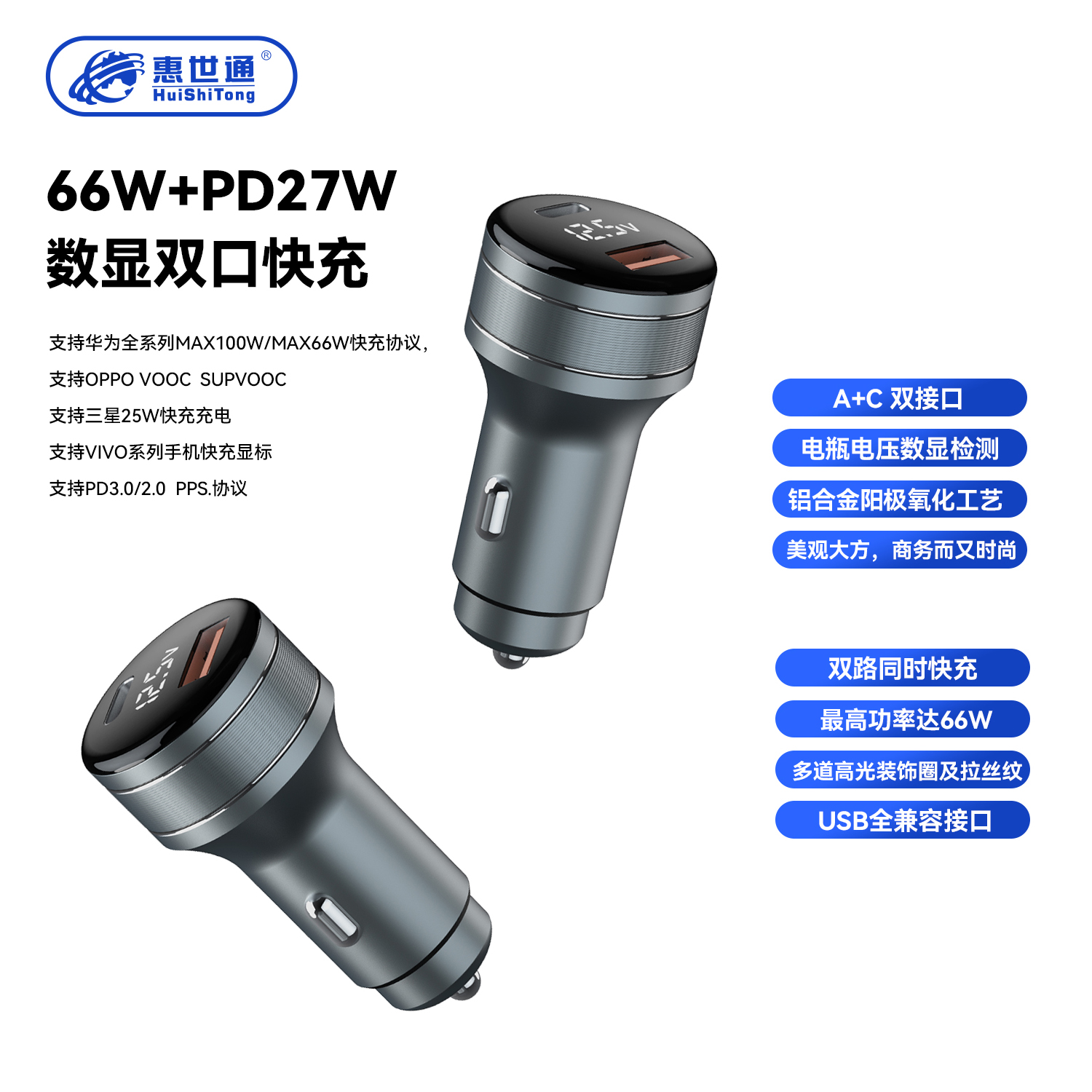 1.阳极氧化合金铝壳,外观时尚,高档大气 2.带锁定环结构钢头, 与车上点烟器插孔配合牢靠,崎岖山路也能稳定充电,液晶数显; 3.OPPO快充+兼容华为、小米、苹果等大多数快充协议,快充手机的最佳伴侣。 4.支持华为手机Max40W Max60W Max100W 快充模式,支持PD27W输出,支持PD3.0/2.0,支持三星25W快充 5.多重保护功能,使用更安全更可靠,手机保护无忧。