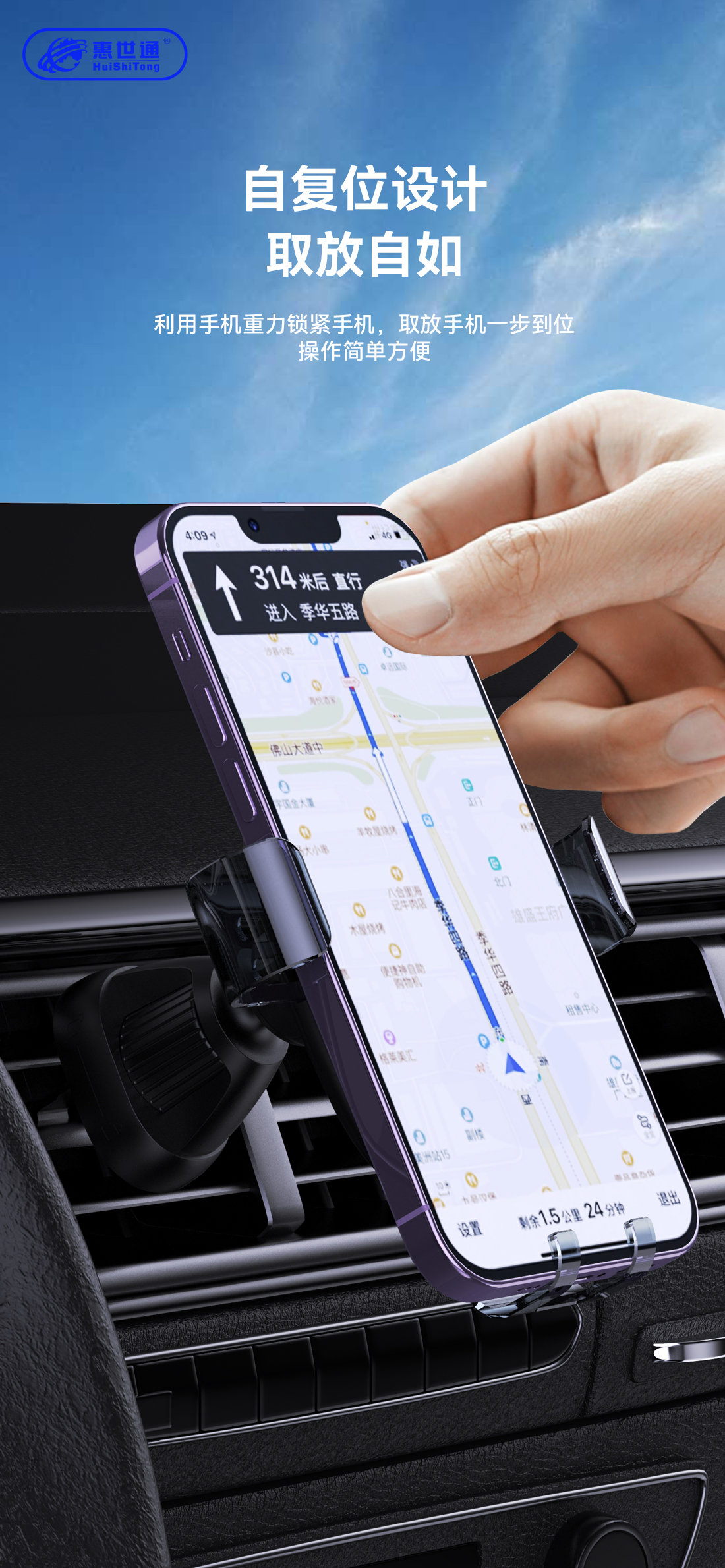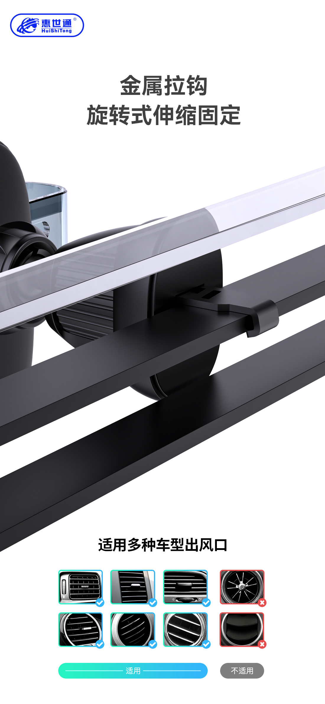 1.合金塑体,透明支架,表面光面处理,电镀装饰,简洁而不俗。 2.重力式支架,万能转向球,想怎么转就怎么转,想怎么玩就怎么玩。 3.螺母式锁勾固定空调出风口夹,无论横向出风口还是竖向出风口,都会一锁即牢,永不脱落。 4.合理的夹臂设计,大多数的手机都不挡手机侧边按键。