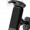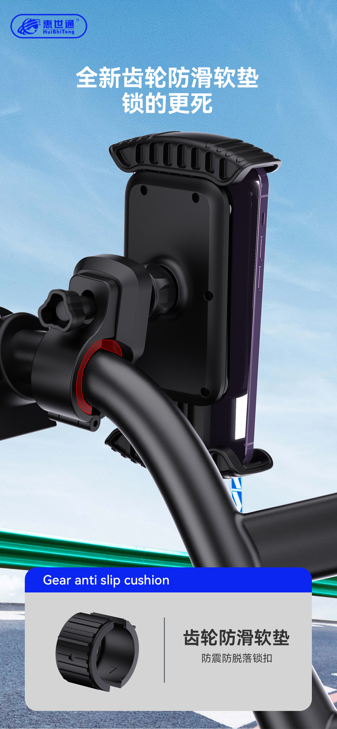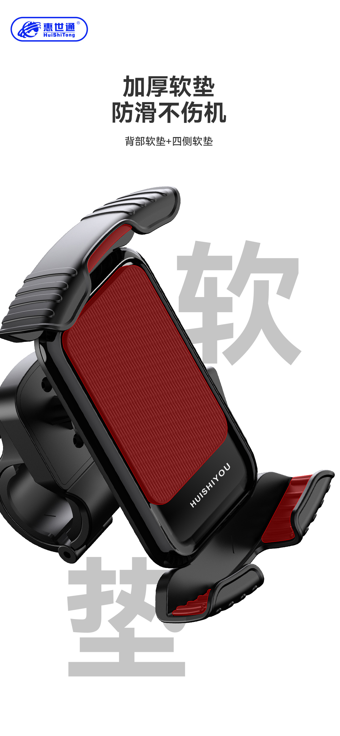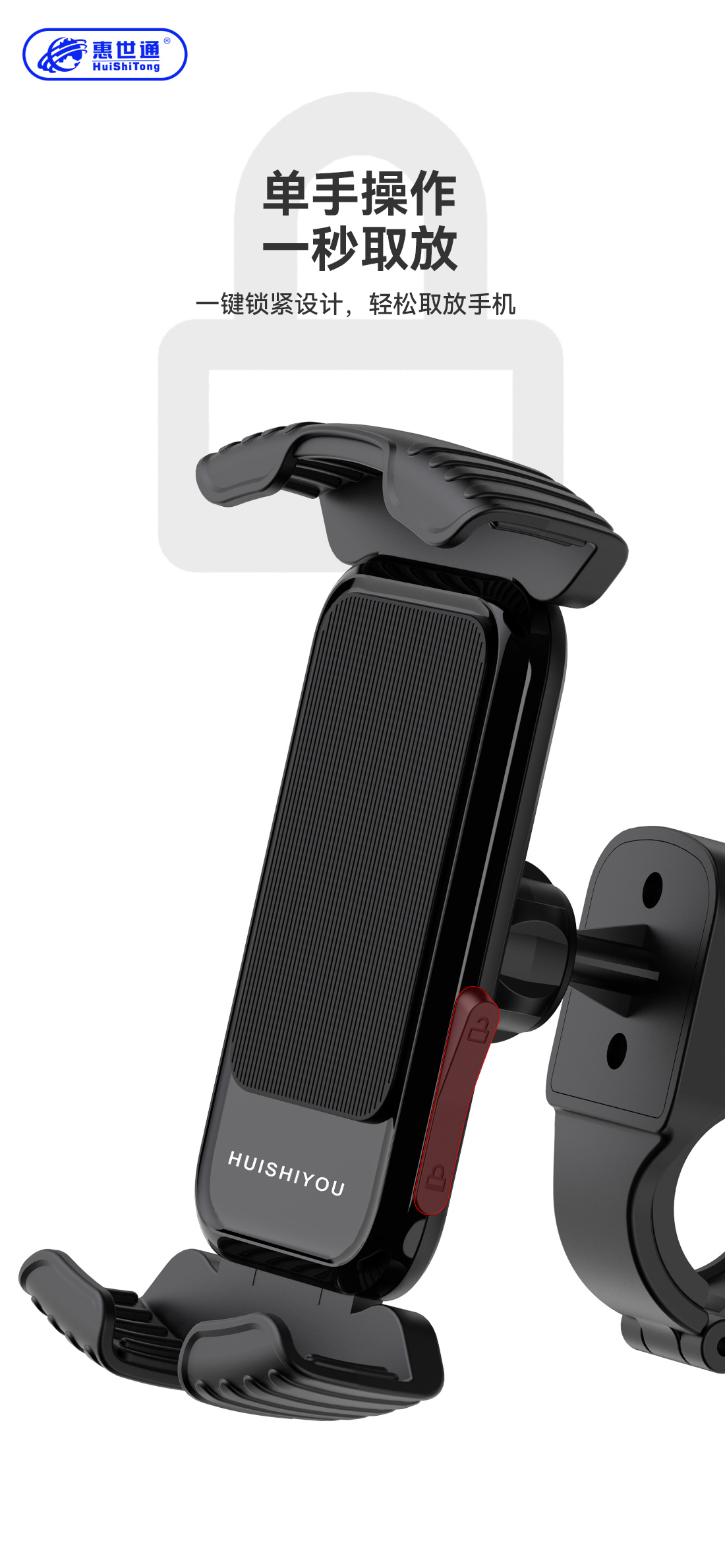 1.ABS+PC合金胶体, 拉丝纹加光面图案+收腰式设计,造型优美。 2.自扣式四向夹臂,夹持稳实,带安全固定锁,永不脱落。 3.夹臂及脱扣按钮自带海绵护垫,防护无处不在。 4.主体与底座滑槽式扭合设计,便于装配,便于清洁。 5.自锁型360度旋转底座,手机方向自由把控而又稳实不晃动,无畏路颠,安静而稳实。 6.带配合螺母固定,无论自行车还是电动车,适配性强、操作简单。