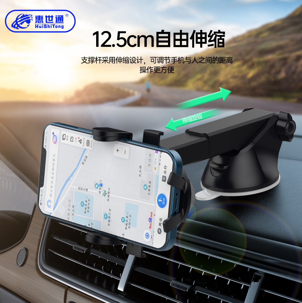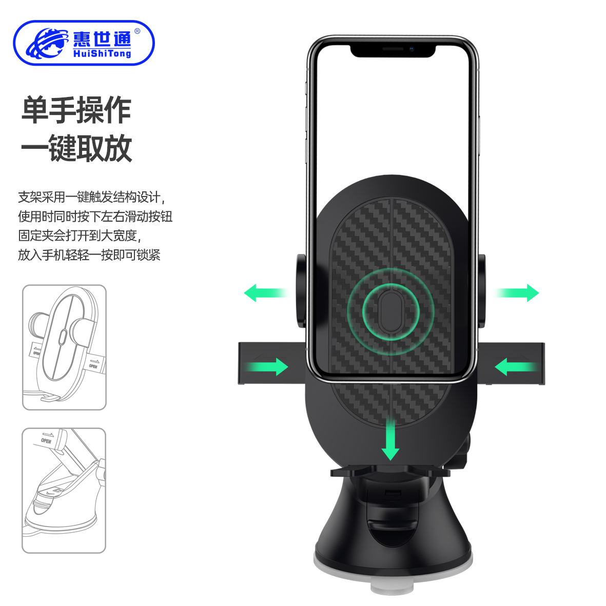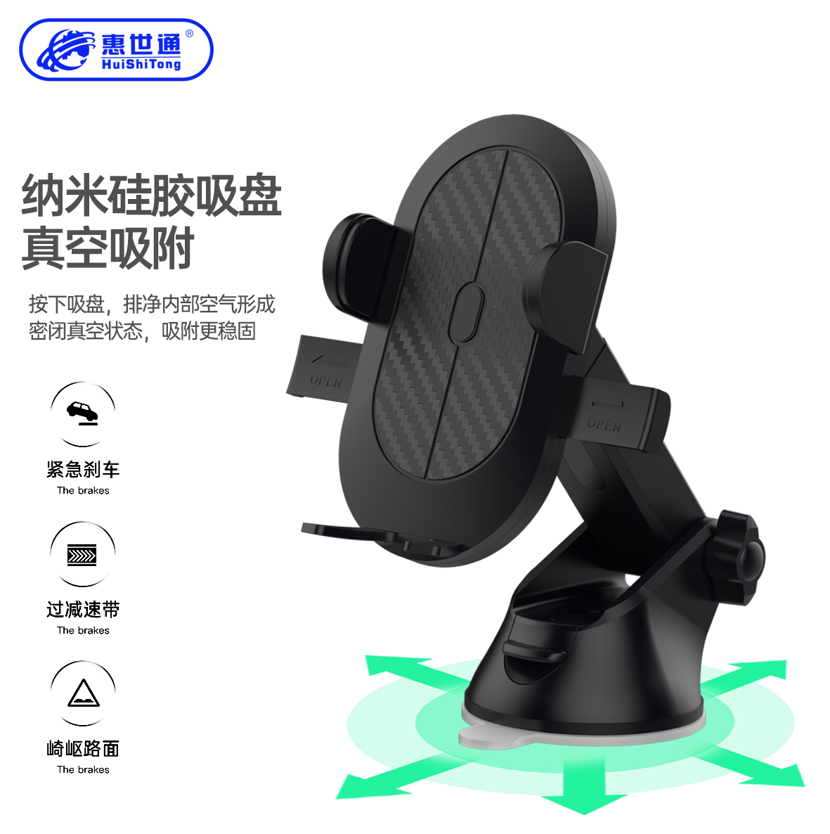 1.单手操作,一碰即合; 按压两侧翼即可打开夹臂,轻松取下手机。 2.夹壁与底托形成三角稳固,不惧颠簸。 3.多方位硅胶护垫,手机防护无微不在。 4.可360度随心旋转,可横屏、竖屏、可调整角度。 5.转向球内独到的硅胶垫设计,方向一紧,永不偏移。 6.真空吸盘底座能伸能屈,可上、下多角度调整,满足不同使用需求。 7.自动锁定式抽拉式伸缩杆设计,轻松易用。 8.多用,适用于中控台、前玻璃、出风口,桌面。 9.纳米硅胶吸盘, 可多次重复使用。